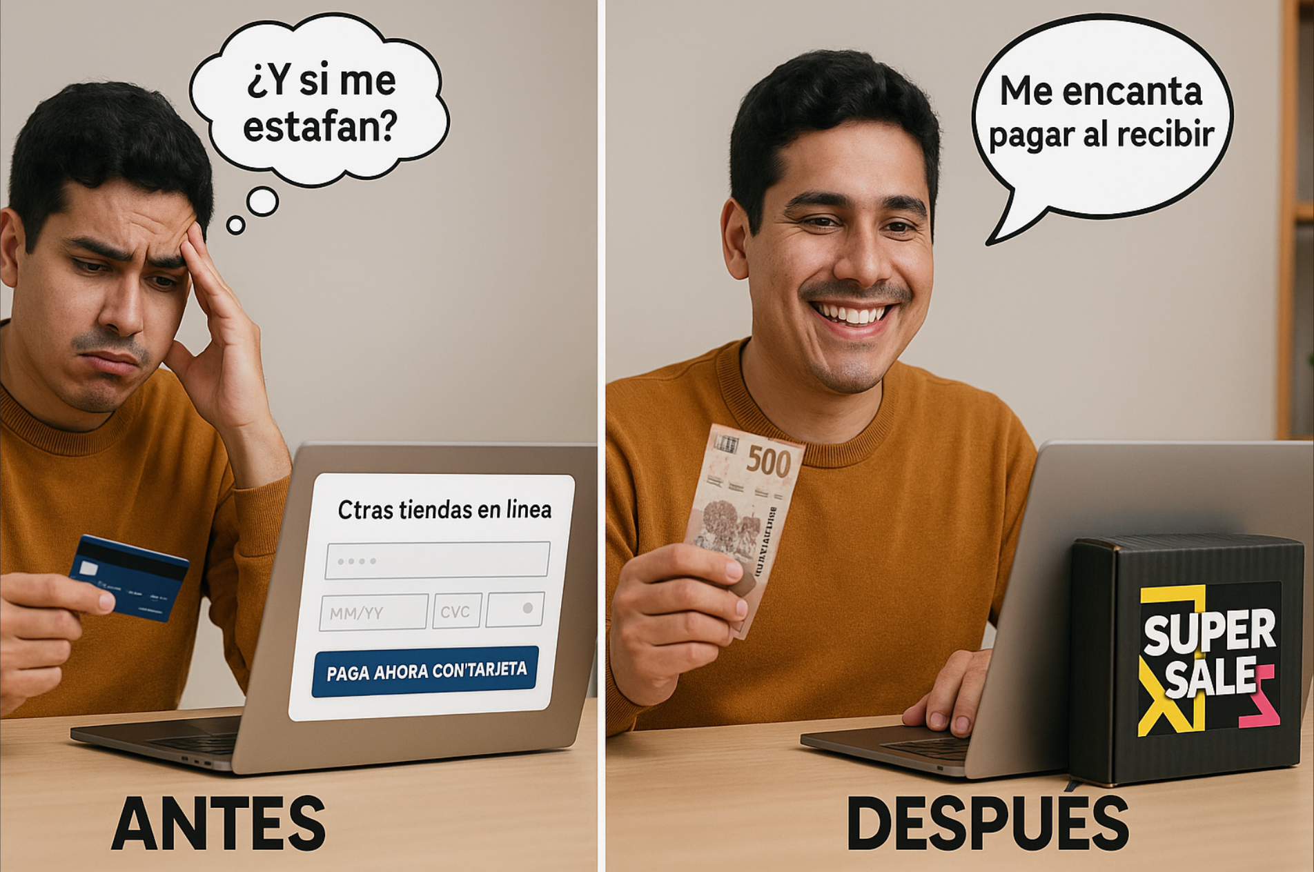 Todos nuestros productos se pagan al recibir en tus manos, nunca pedimos un solo peso por adelantado